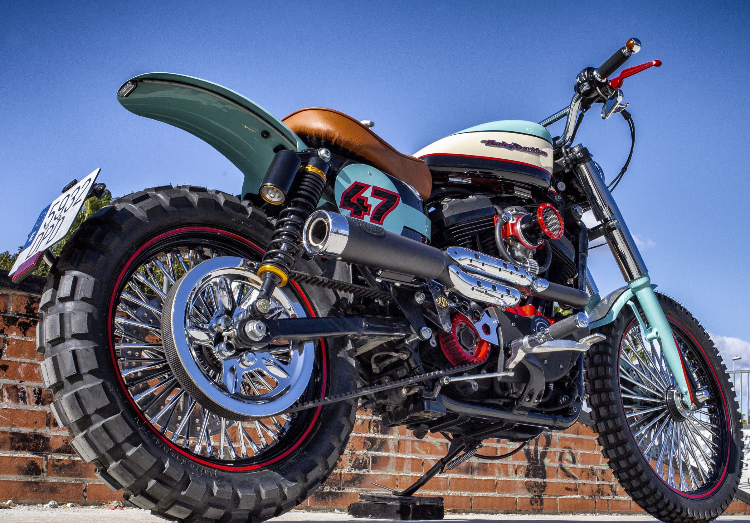 For this project, the team started out with a 2005 Harley Davidson Sportster 883 R, tossing the initial idea for normal-spoke tires in favour of “Fat daddy” rims beneath a modified fork and top covers.